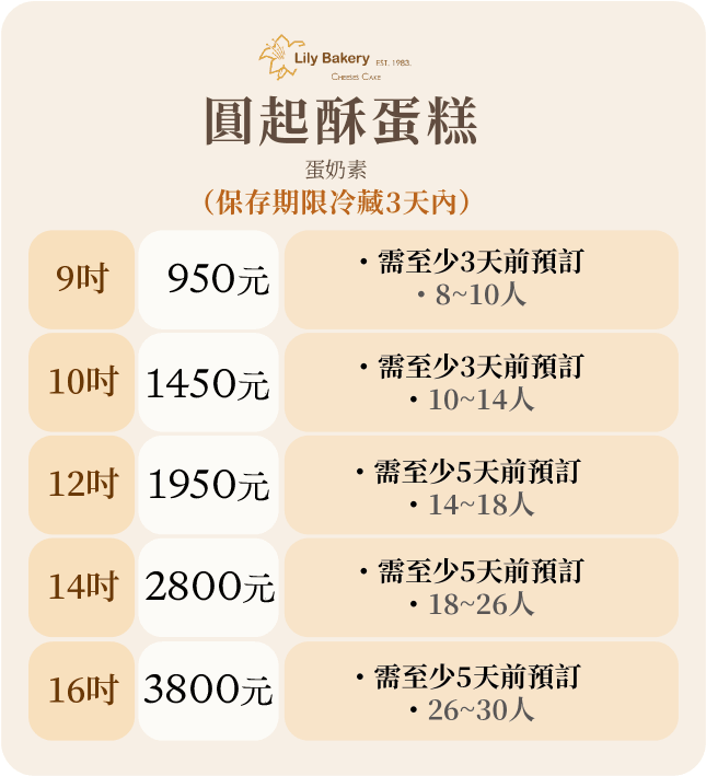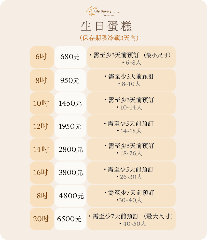 6吋 $680 8吋 $950